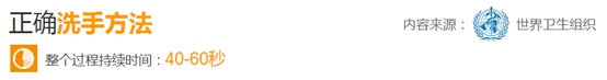 世界卫生组织WHO指出,洗手时,用肥皂持续搓揉20秒,丰富的泡沫可以破坏手上携带大量病菌的油脂和污垢,并使手具有宜人的气味。采用正确的方式搓洗后,再用流动水冲洗15秒以上,整个洗手过程40-60秒。